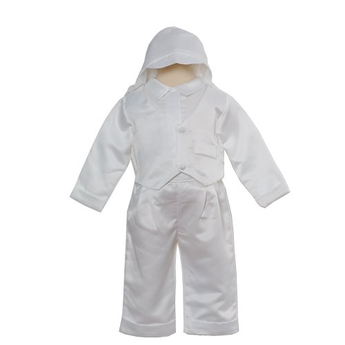A beautiful Christening outfit for your baby boy. White brushed satin pants button on at waist to long sleeve brushed satin shirt with attached vest. Satin covered front and waistband buttons. Pearlized back shirt buttons. Matching cap included. Washable polyester. Comes with satin, padded hanger and garment bag.