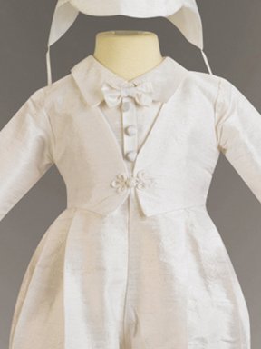 Handsome silk longall romper with three button d?cor, vest, attached bowtie, collar and hat. Perfect for christening, baptism, dedication, blesssings and weddings. (Please note that all natural silk fabrics have slubs which are an inhearent part of the fibers and add to the individualit