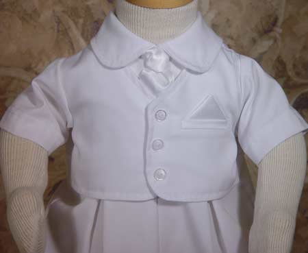 - One-piece Christening outfit with vested front, tie and pocket hankie