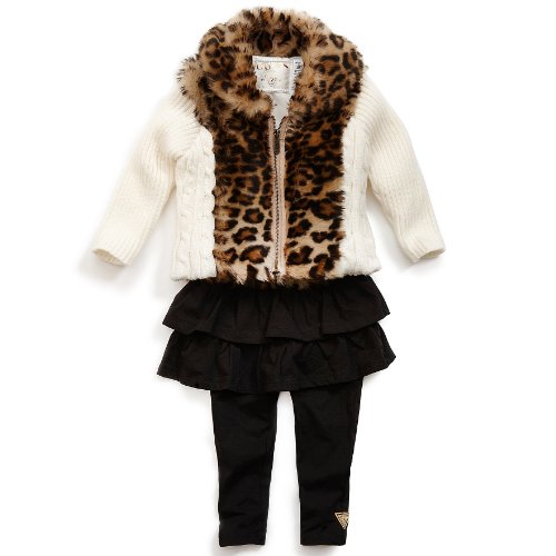 Your little one will be on her road to high couture fashionita with this lovely outfit by Guess. The leggings include a ruffled, attached skirt for flair; the sweater is a lovely cable knit with a fur front, collar, and convenient front zipper.