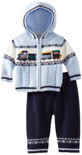 Baby boys cotton hooded sweater and pant 2 piece set. Zip front hooded sweater with train chest applique. Pull on elastic waist sweater pant with knit pattern around ankles.